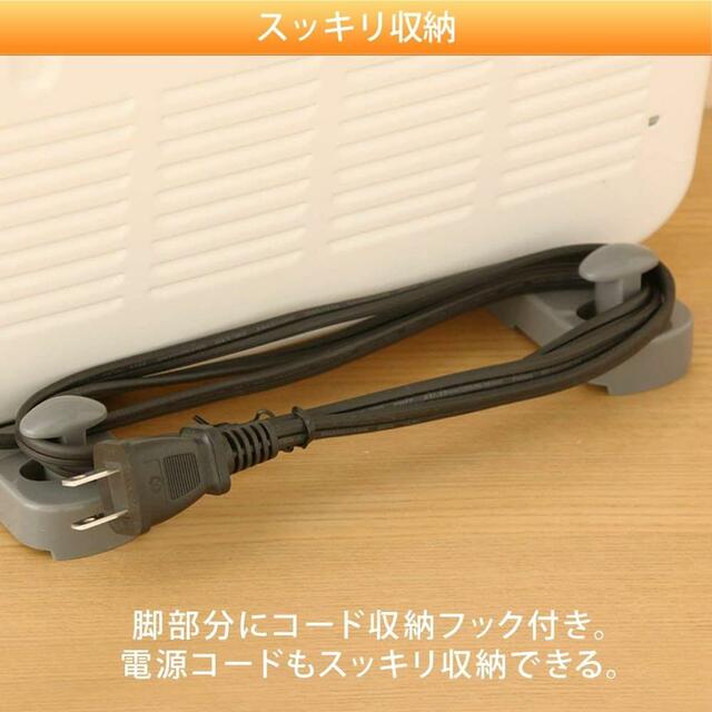 操作は本体上部のスイッチを回すだけと直感的。転倒時電源オフ機能を備え、安全面にも配慮されています。コード収納フック付きで、使わない季節もスッキリ収納可能です。