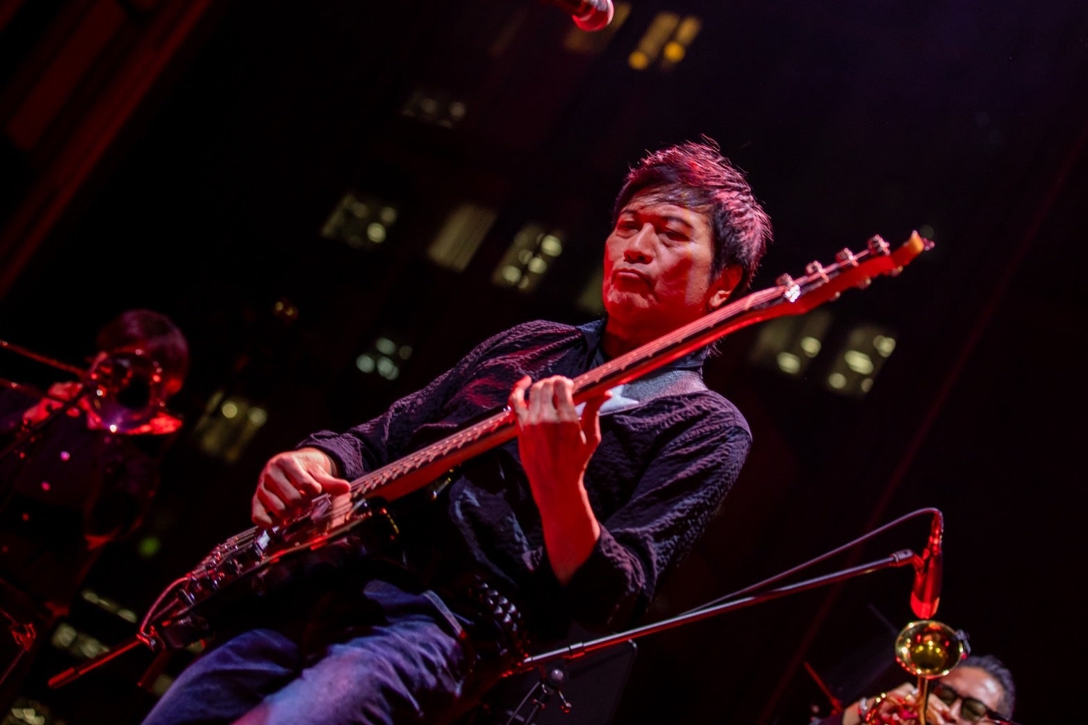いわく、昨年10月に東京タワーの展示施設「TOWER GALLERY」で行なわれた文化祭的イベント『PERSONZ EXHIBITION Ver.2』で、2015年12月30日に品川ステラボールで行なわれた『SPECIAL THANKS FOR “ROAD TO BUDOKAN”』の2日目、ブラスセクションを迎えたステージの映像を久々に見て胸を打つものがあったという渡邉が再度のコラボレーションを望んだのだという。また、「背中でブラスの音圧を感じながら演奏できるのが凄く幸せです」と語り、従来通りにベースアンプを後ろに置くとブラスセクションの姿が見えづらくなるため、この日は自身の前にベースアンプを置く変則的な配置であることを明かした。つまり渡邉は前後から大音響の渦を浴びるという異例の格好だったわけだ。