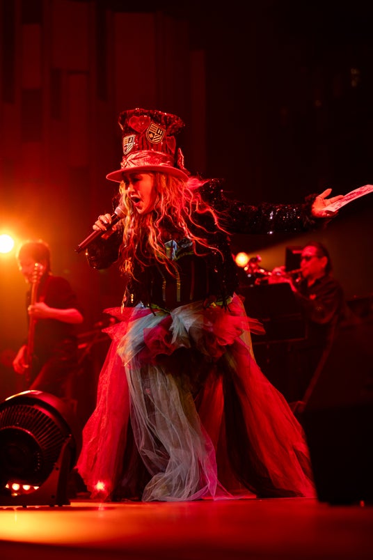 最新アルバムの流れと同様に「WONDERLAND」へと移り、ジャジーな曲調と相俟って華麗かつ優雅な情調が場内を包む。赤いトップハットを被ったJILLは特大トランプカードを客席へ投げ、そのカードはさながらこの日限りのVIPショーへといざなう招待状のようだ。ドラム、ベース、ホーン、ギターとソロが披露されるたびに客席の歓声が大きくなり、場内の空気が徐々に熱を帯びたものになっていく。