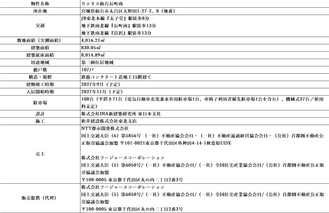 NTT都市開発株式会社(本社:東京都千代田区、代表取締役社長 池田 康、以下「NTT都市開発」)と株式会社フージャースコーポレーション(本社:東京都千代田区、代表取締役社長 小川 栄一)は、宮城県仙台市太白区にて開発中の新築分譲マンション「ウエリス仙台長町南(以下「本物件」)」(総戸数107戸)について、2026年1月10日(土)より「マンションギャラリー(モデルルーム)」をオープンします。