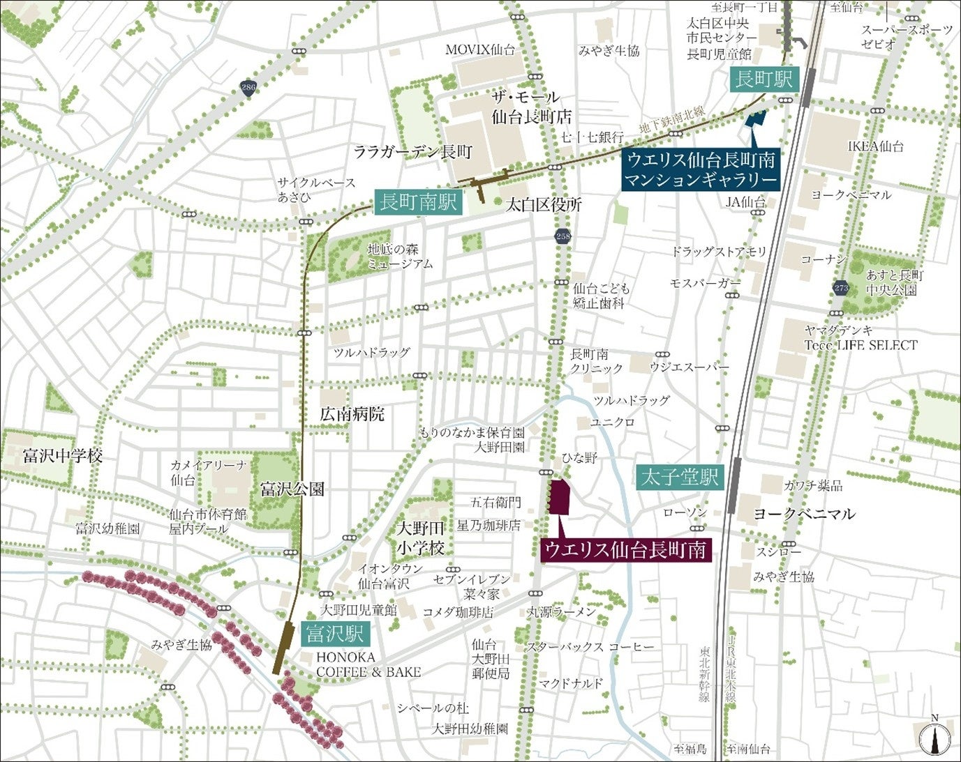 本物件は、地下鉄南北線「富沢」駅、「長町南」駅と、JR東北本線・仙台空港アクセス線「太子堂」駅の3駅3路線が利用可能です。大型商業施設が集積する「長町南エリア」、都市機能が進化する「あすと長町エリア」、そして豊かな自然と落ち着きのある「富沢エリア」。これら仙台を代表する3つのエリアの中心に位置し、ショッピングやグルメ、自然環境まで、多彩な魅力を日常的に享受できます。