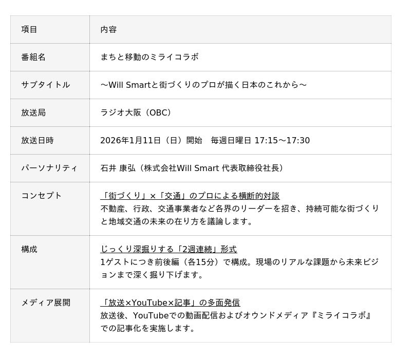 「移動」を支えるテクノロジー企業として地域交通インフラの課題解決に取り組む株式会社Will Smart(東京都江東区 代表取締役社長:石井康弘、以下 Will Smart)は、2026年1月11日(日)より、ラジオ大阪(OBC)にて新番組『まちと移動のミライコラボ ~Will Smartと街づくりのプロが描く日本のこれから~』を開始いたします。