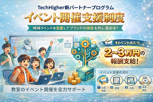 10代向けデジタル人材育成サービス『TechHigher』を運営する株式会社エクシード(本社:東京都渋谷区、代表取締役:澤部愛子)は、ライセンス提携校が主催する体験会・発表会などの地域イベントを支援する新制度「イベント開催支援制度」を開始しました。本プログラムは、教室が地域に根ざした教育活動などを行うことでTechHigherブランドの価値向上に貢献し、その取り組みに対して報酬を受け取れる仕組みです。