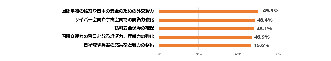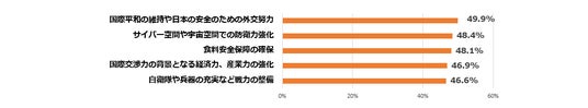 日本の防衛力強化のために何が必要だと思うか、複数回答で聞くと、上位3位は、「国際平和の維持や日本の安全のための外交努力」49.9%(前回25年3月6日調査44.2%)、「サイバー空間や宇宙空間での防衛力強化」48.4%(41.0%)、「食料安全保障の確保」48.1%(44.6%)だった。前回の調査で1位だった「食料安全保障の確保」は今回3位だった。また、「サイバー空間や宇宙空間での防衛力強化」は前回調査では5位だったが、今回2位に上昇した。