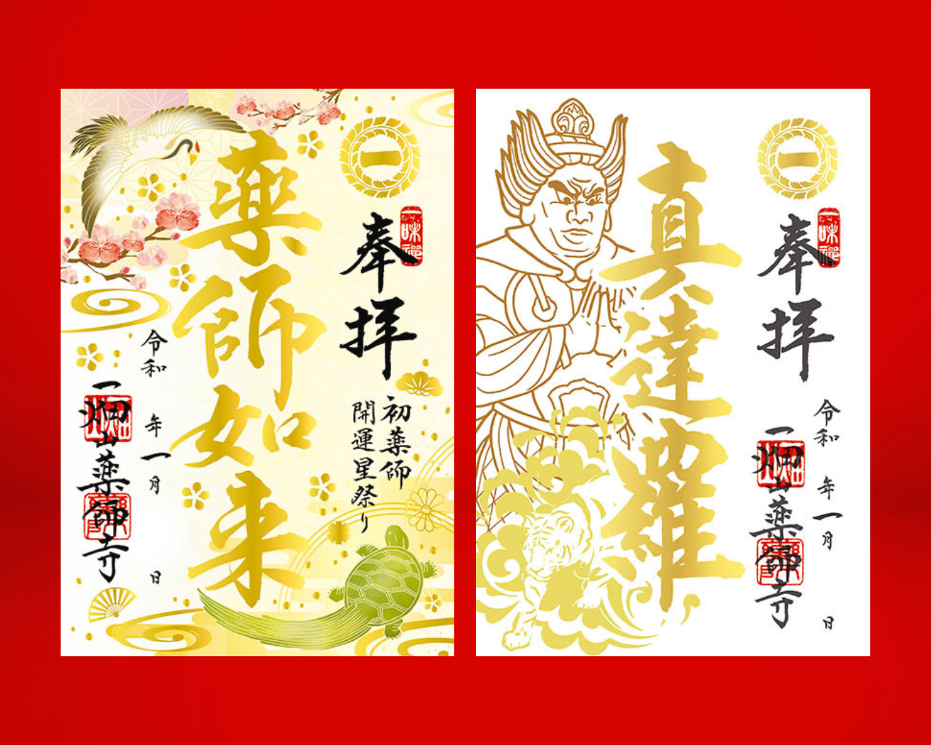 一畑山薬師寺の月替わり限定ご朱印が5年ぶりに刷新。1月限定のご朱印は、薬師如来様と真達羅(まだら)大将様の2種類です。