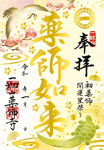 1年の始まりに開運・家内安全・無病息災を祈願する“初薬師”。御本尊の薬師如来様は病気をはじめとするこの世の願いを叶えていただける仏様です。また正月らしくめでたい鶴と亀をあしらっています。
