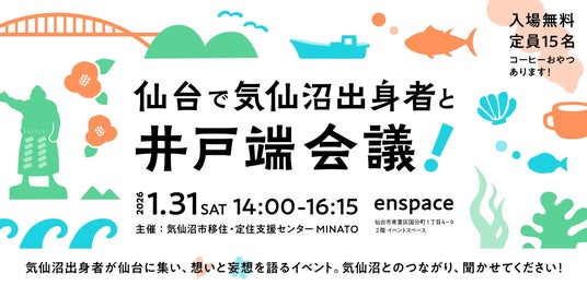 気仙沼市移住・定住支援センターMINATO(運営:一般社団法人まるオフィス)は、2026年 1月31日(土)、仙台市のenspace(エンスペース)にて、気仙沼出身者を対象とした交流イベント「仙台で気仙沼出身者と井戸端会議!」 を開催します。