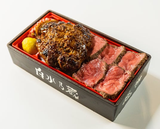 ★実演★〈白水乃蔵〉あか牛入りハンバーグとステーキ重 2,160円あか牛をつかったジューシーなハンバーグと柔らかなステーキのお重。