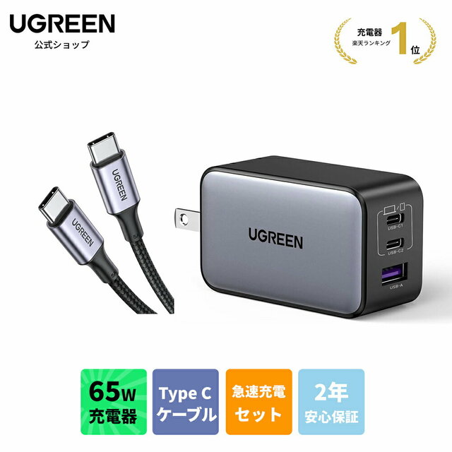 65W高出力・3台同時充電・GaN II世代を採用した「UGREEN 65W 3ポートUSB-C充電器」と高耐久ケーブル「UGREEN USB-Cケーブル 1m」のセットが、現在、楽天市場で40%ポイント還元に!