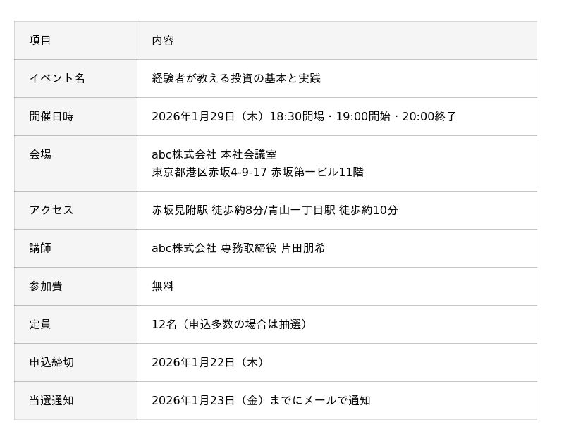 abc株式会社(本社:東京都港区、代表取締役:松田 元、以下「当社」)は、2026年1月29日(木)19:00より本社会議室にて、投資初心者から経験者まで幅広い層を対象とした無料投資セミナーを開催いたします。
