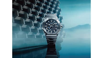 伝統技法「木組」から着想を得た格子状の立体文字板に、日本の伝統的な青色である「縹色」を採用した耐衝撃ウオッチ。「MR-G」シリーズの製造拠点がある山形県の国宝・五重塔が朝霧に包まれている幻想的な情景からインスピレーションを得て、青のダイアルでその情景を表現。光や角度によって繊細な表情を変え、夜明けから朝へと移ろう美しさを映し出す。