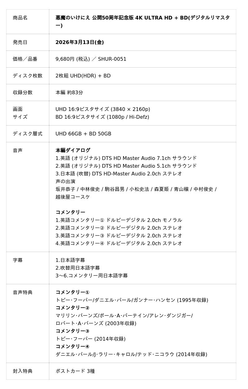 そして、早くも、そのパッケージソフト化「『悪魔のいけにえ』公開50周年記念版 4K ULTRA HD + BD(デジタルリマスター)」が、3月13日(金)発売決定いたしました。