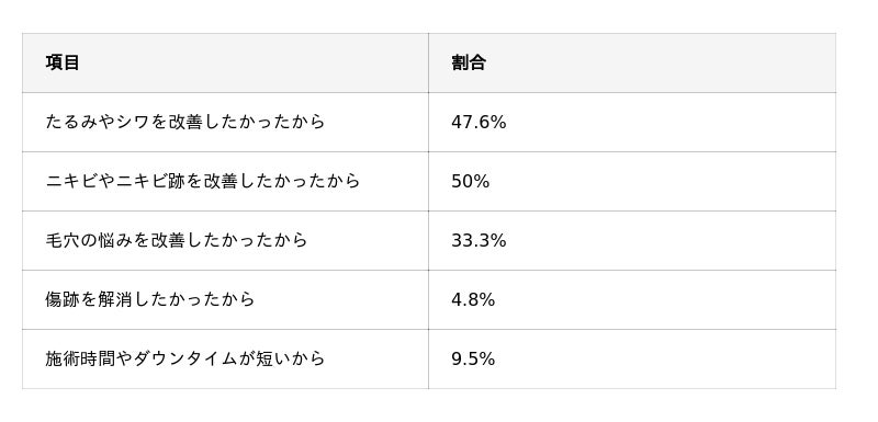 また、「たるみやシワを改善したかったから」(47.6%)、「毛穴の悩みを改善したかったから」(33.3%)といった回答も多く、特定の悩みに限らず、複数の肌悩みをまとめてケアしたい方に選ばれている施術であることが分かります。