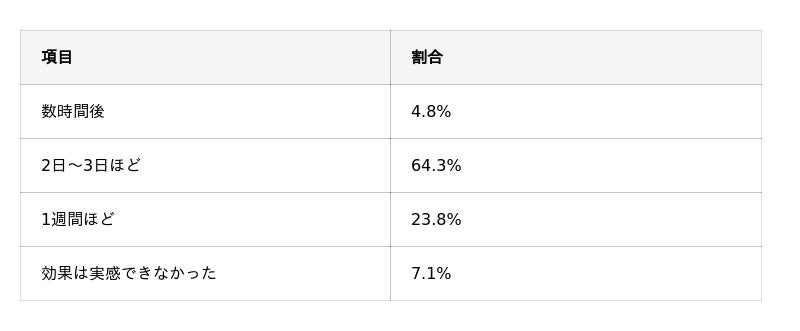 - 効果を感じ始めた時期は「2日~3日ほど」(64.3%)が最多