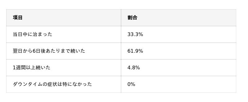 - ダウンタイムは「翌日から6日後あたりまで」(61.9%)が最多