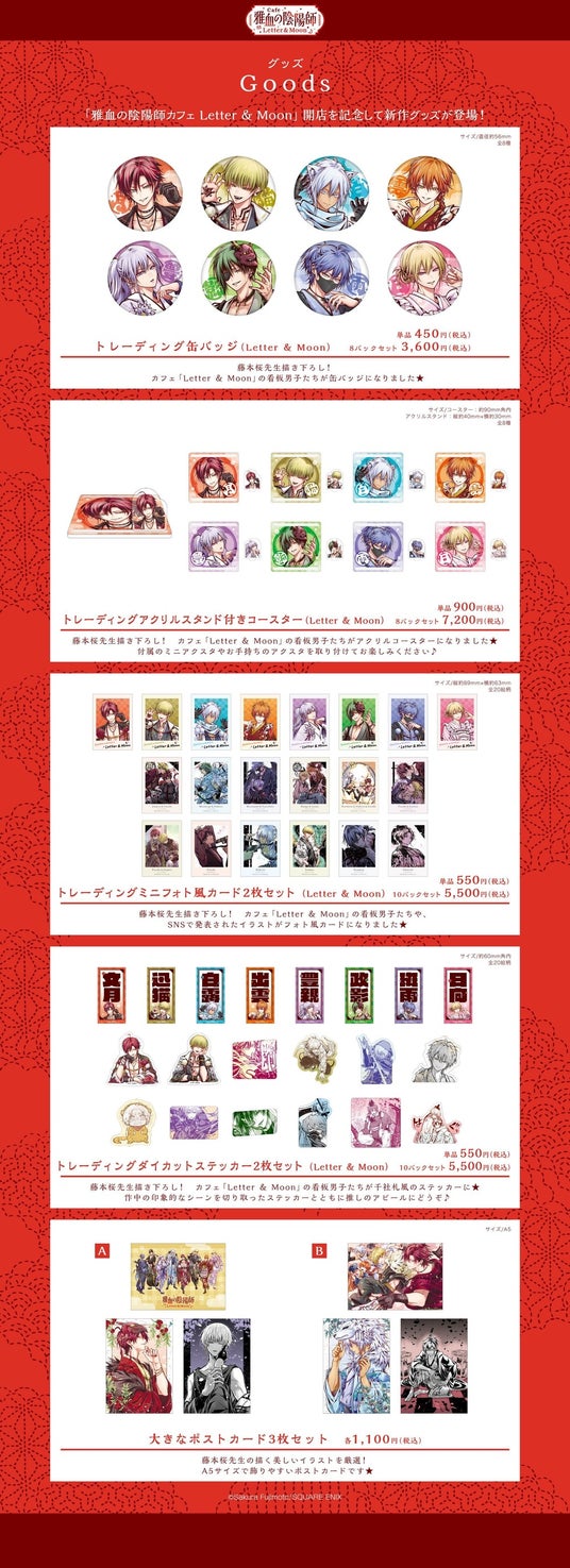 「雅血の陰陽師カフェ Letter & Moon」で販売されるグッズラインナップをご紹介いたします。