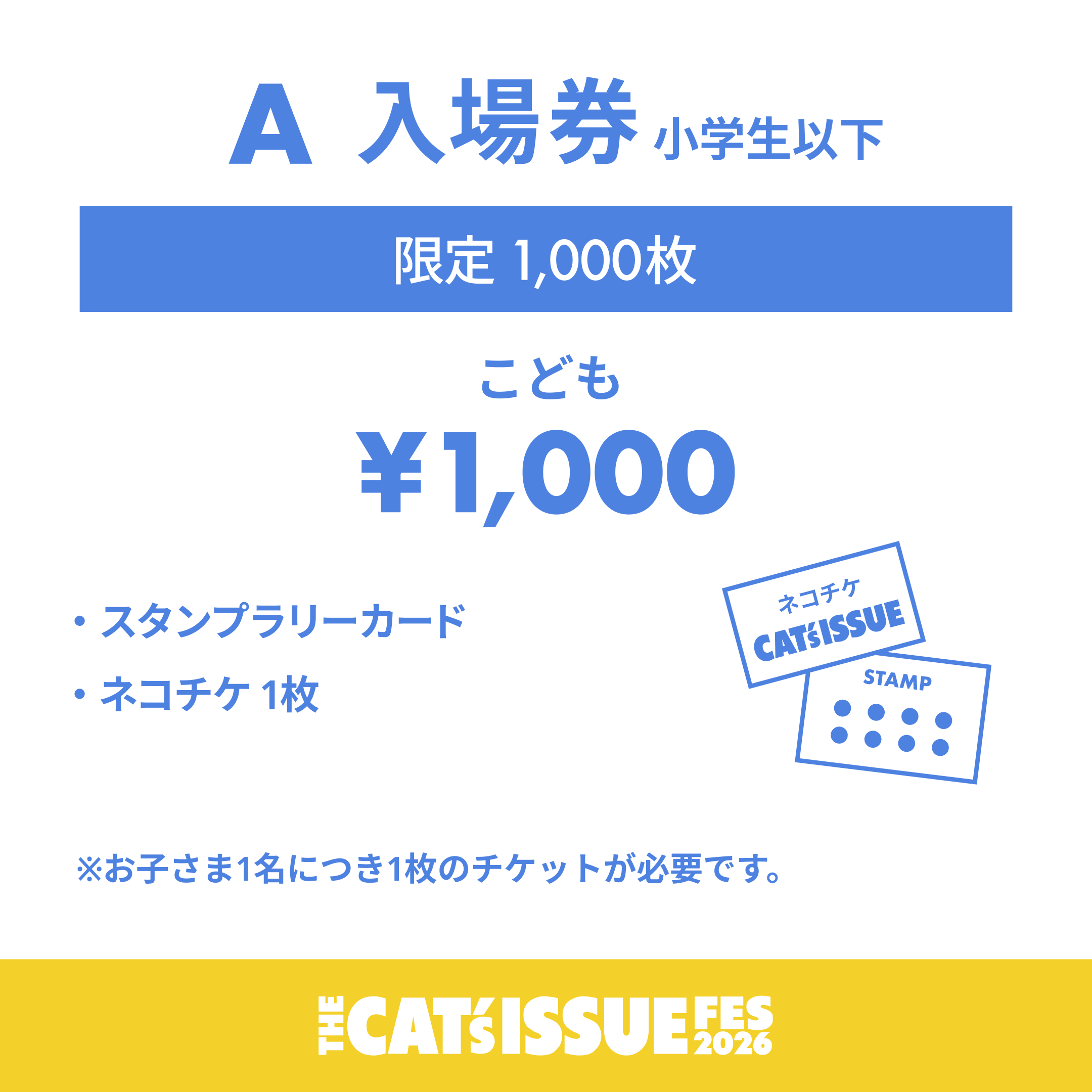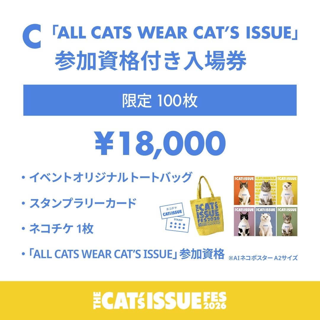 「THE Cat’s ISSUE FES 2026」では4種類の入場券を販売いたします。それぞれ販売枚数に上限がございますので、お早めの購入をおすすめいたします。※「THE Cat’s ISSUE FES 2026」にご参加いただくには、入場券の購入が必要です。