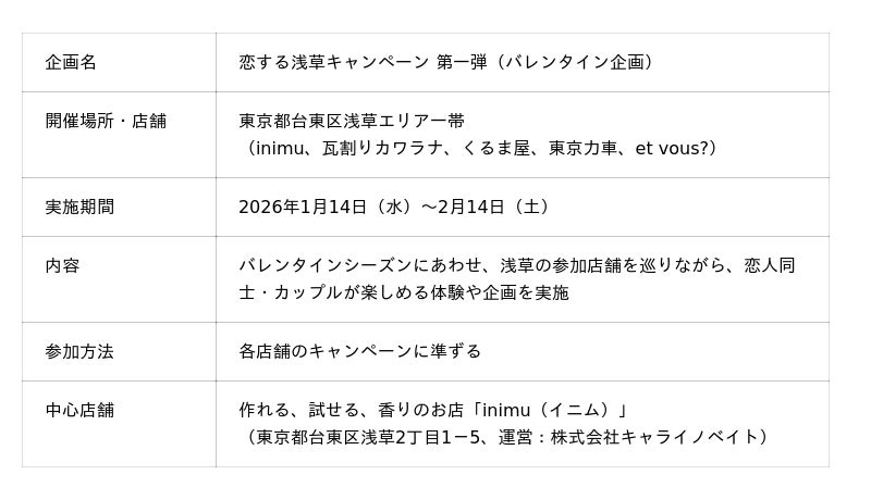 浅草エリアにて、「恋する浅草」キャンペーン第一弾を開催します。本キャンペーンは、恋する2人を応援するキャンペーンで、作れる、試せる、香りのお店「inimu(イニム)」(東京都台東区浅草2丁目1-5、運営:株式会社キャライノベイト)を中心に、人気の「瓦割りカワラナ」、人力車の「くるま屋」「東京力車」、フレンチレストランの「et vous?」と連携して展開する企画です。