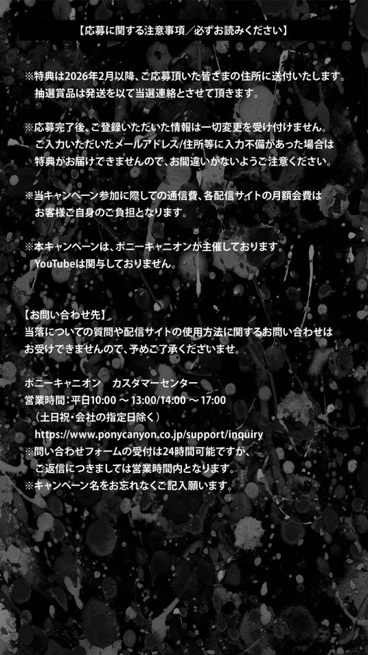 【当選者へのお願い】 A賞のサングラスには鋭利なパーツが含まれております。周囲の方やご自身を傷つける恐れがあるため、ライブ会場や混雑した場所でのご使用は絶対にお控えください。