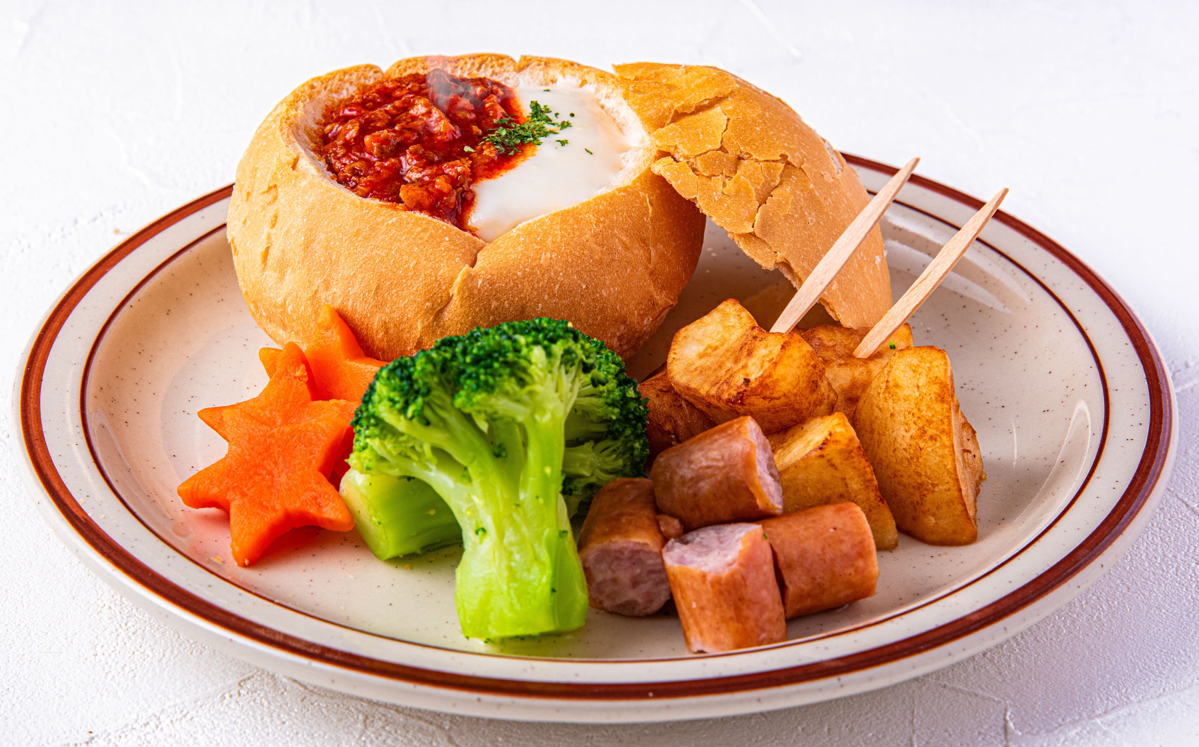 コク深いチーズにミートソースの香ばしさが溶け合い、食欲をそそる味わいに仕上げました。星型にカットしたにんじん、ホクホクのジャガイモ、彩り豊かなブロッコリーをたっぷりディップ。とろ~り絡むソースと野菜の甘みが広がる、見た目も楽しいごちそうフォンデュです。