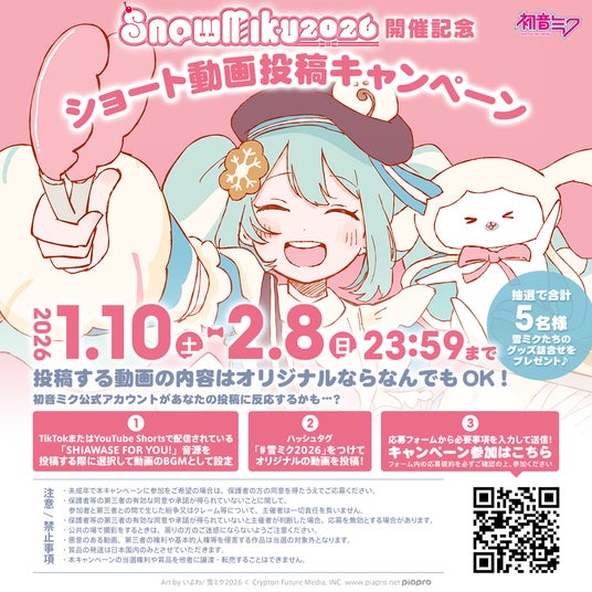 また、2026年1月10日(土)からは『SHIAWASE FOR YOU!』を対象楽曲とするショート動画の投稿キャンペーンも実施いたします。投稿する内容は、『SHIAWASE FOR YOU!』をBGMに設定した投稿者のオリジナル動画であれば、ダンス、イラスト制作など何でもOKです。TikTokまたはYouTube Shortsにハッシュタグ「#雪ミク2026」をつけたオリジナル動画を投稿した上で、応募フォームより必要事項を入力・送信してご参加ください。ご参加いただいた方の中から抽選で5名様に「雪ミクたちのグッズ詰め合わせ」をプレゼントいたします。皆さまのショート動画の投稿とご参加をお待ちしております!【参加方法】