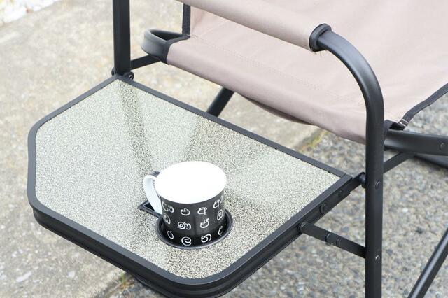 折りたたみできるサイドテーブルにはカップホルダーを完備。