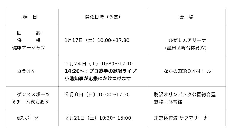 (カラオケ、囲碁、将棋、健康マージャン、ダンススポーツ、eスポーツ)