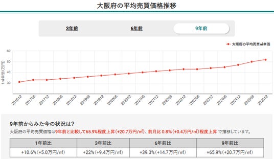 2.2025年12月時点の大阪府全体の平均売買平米単価は9年前比で65.9%程度上昇し、堅調な右肩上がりが継続