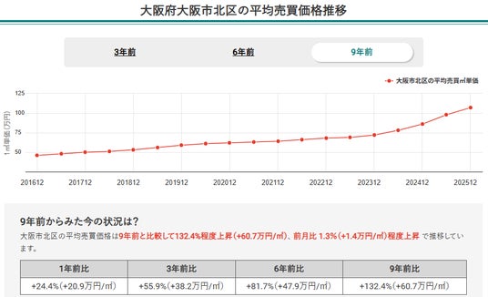 マンションナビの最新データによると、今回の調査では北区が過去9年間で132.4%という驚異的な上昇率を記録し、大阪市内24区中で第1位にランクインしました。
