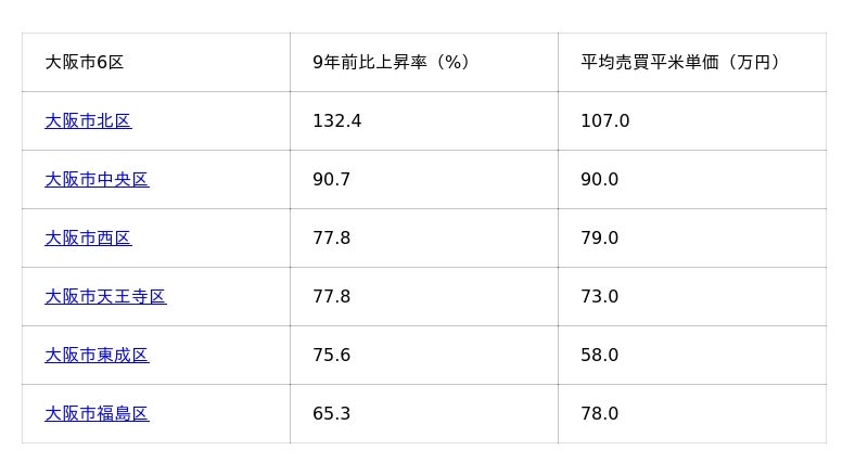 表1:大阪市6区の価格上昇率と平均売買平米単価(2025年12月現在)※価格上昇率順