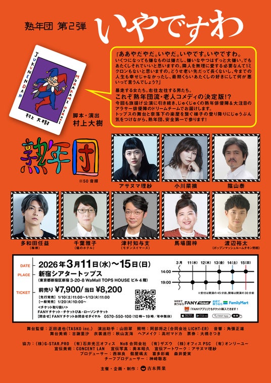 熟年団 第2弾公演『いやですわ』を3月11日(水)~3月15日(日)の5日間、新宿シアタートップスにて開催します。