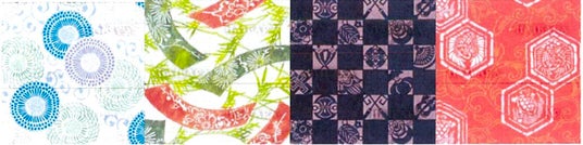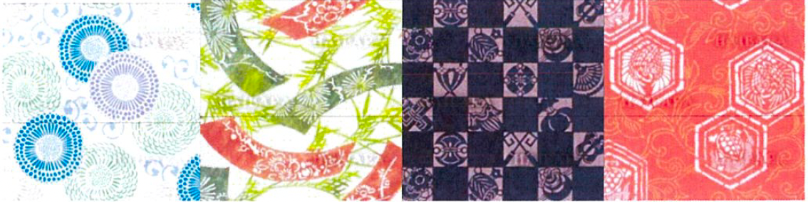写真左から、「菊唐草」「紋入り七夕飾り」「宝尽くし」「鶴亀入亀甲唐草」