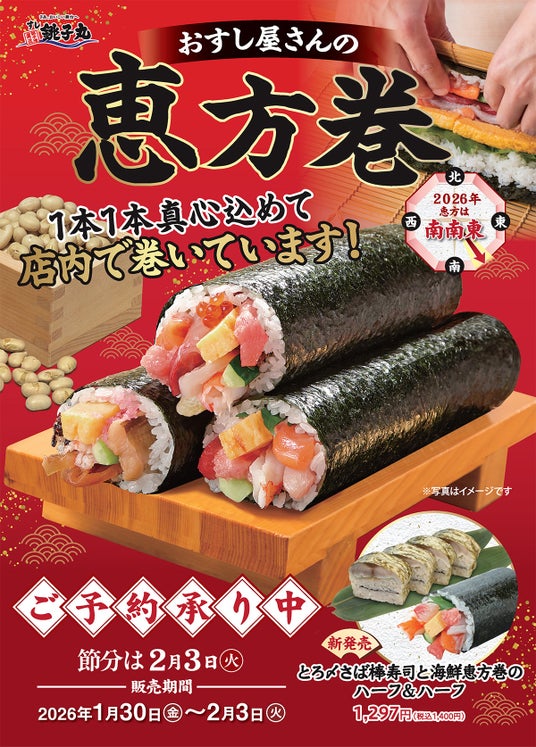 株式会社銚子丸(本社:千葉県千葉市、代表取締役:石井 憲)が展開する「すし銚子丸」では、2026年の節分(2月3日)に向けた「恵方巻」の予約受付を2026年1月10日(土)より全店にて開始いたします。