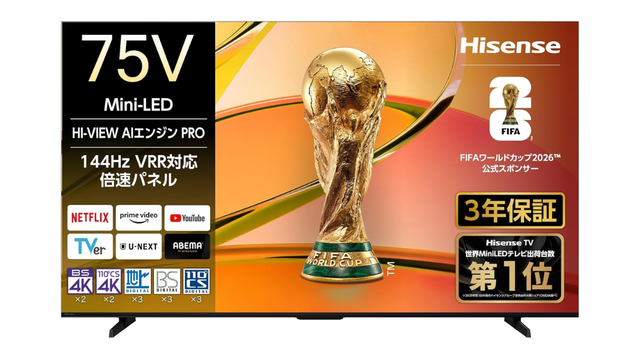 Mini LEDと広域式量子ドットで“75V型”の大迫力! ハイセンスの高コスパ4Kテレビが18%オフで17万円切りの過去最安値に!