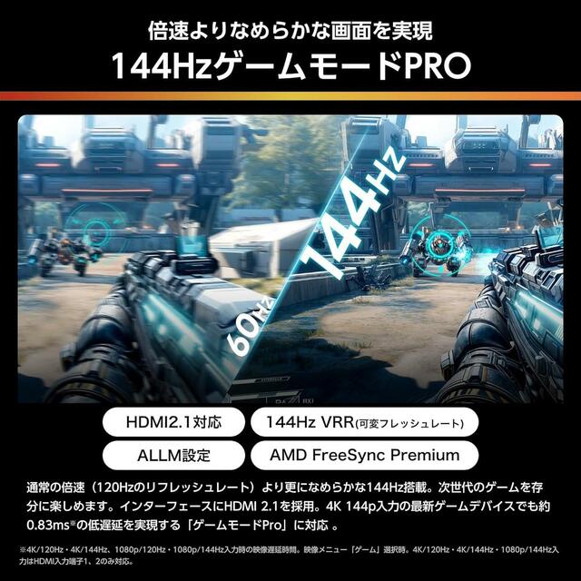 144Hzの高リフレッシュレートは、倍速(120Hz)を超えるなめらかさを実現。HDMI 2.1対応のゲームモードPROでは、4K/144Hz入力時で約0.83msの低遅延を達成します。