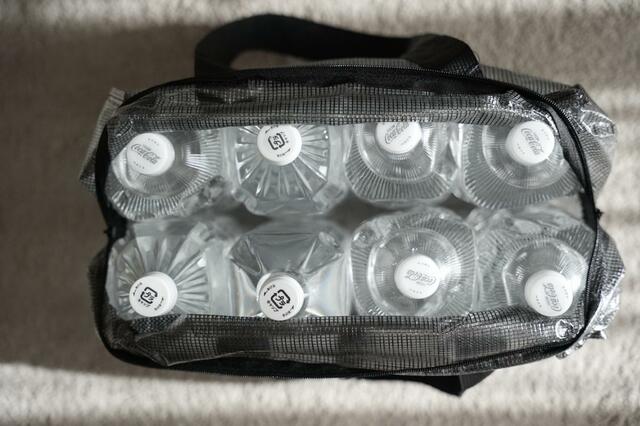 耐荷重は5kgなので、中身の入ったペットボトルをこんなに入れて使うことはできませんが、容量の大きさは分かってもらえるかと思います。