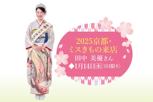 初日の1月14日(水)には、「2025京都・ミスきもの」田中美優さんが1日限定でご来店し、会場入口でお出迎えや、会場内にて京都の名品をご紹介いたします。