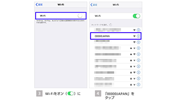 利用するには、「設定」のアプリを開いて、Wi-Fiの接続をオンにする。表示されるネットワーク名(SSID)「00000JAPAN」を選択してタップすると使える。