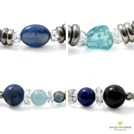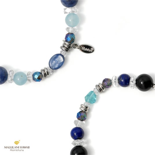 深みのあるブルーが美しいカイヤナイトを主役に、アパタイトのランダムカットをアクセントとして、ラピスラズリやソーダライト、アクアマリンなどを組み合わせ、空から宇宙へと広がるブルーのグラデーションで仕立てました。