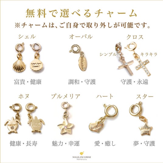 キラリと光るオリジナルチャームには、ハワイ語で「神に護られた」との意味を持つ「Malulani」と刻印。