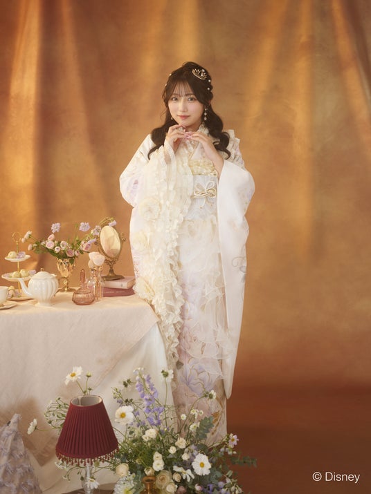 柔らかいクリームの地色にピンクや紫のお花を描き、ディズニープリンセスの物語に登場するキャラクターやアイコンなどを繊細に散りばめたデザイン。今回はレースやフリルを組み合わせドレス感覚で楽しんでいただける仕様で華やかさをプラス。和と洋の組み合わせが目を引く1着です。