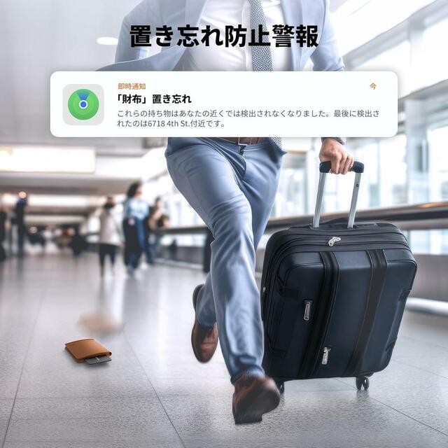 一定距離を離れると通知する置き去り警報にも対応。財布を忘れたり、なくしたりを防いでくれます。1台のiPhoneで最大32個のタグを管理でき、5台のAppleデバイスとの情報共有にも対応していますよ。