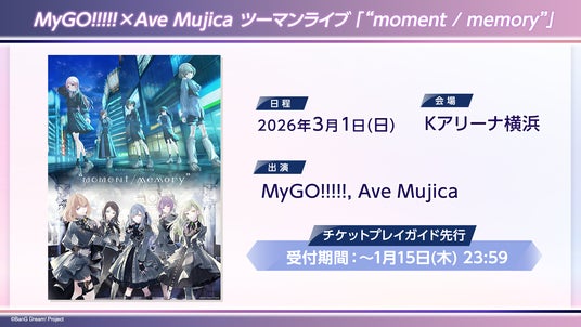 なお、millsageからKey.&Vo.汐見蛍役の薬師寺李有さん、一家Dumb Rock!からGt.&Vo. 須賀蕾叶役 橘めいさん、Gt.&Vo.馬橋心玖役の涼泉桜花さんが、3月1日(日)にKアリーナ横浜で開催される、MyGO!!!!!×Ave Mujica ツーマンライブ「“moment / memory”」に、オープニングアクトとして出演することが決定いたしました。