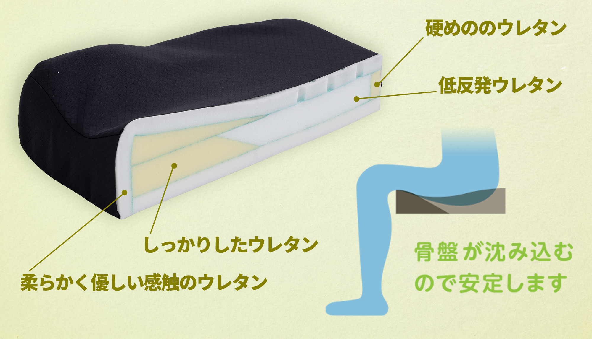 硬度・密度の異なるウレタンを尾骨部・大腿部などに配置することにより、体圧分散と姿勢の安定を実現しました。