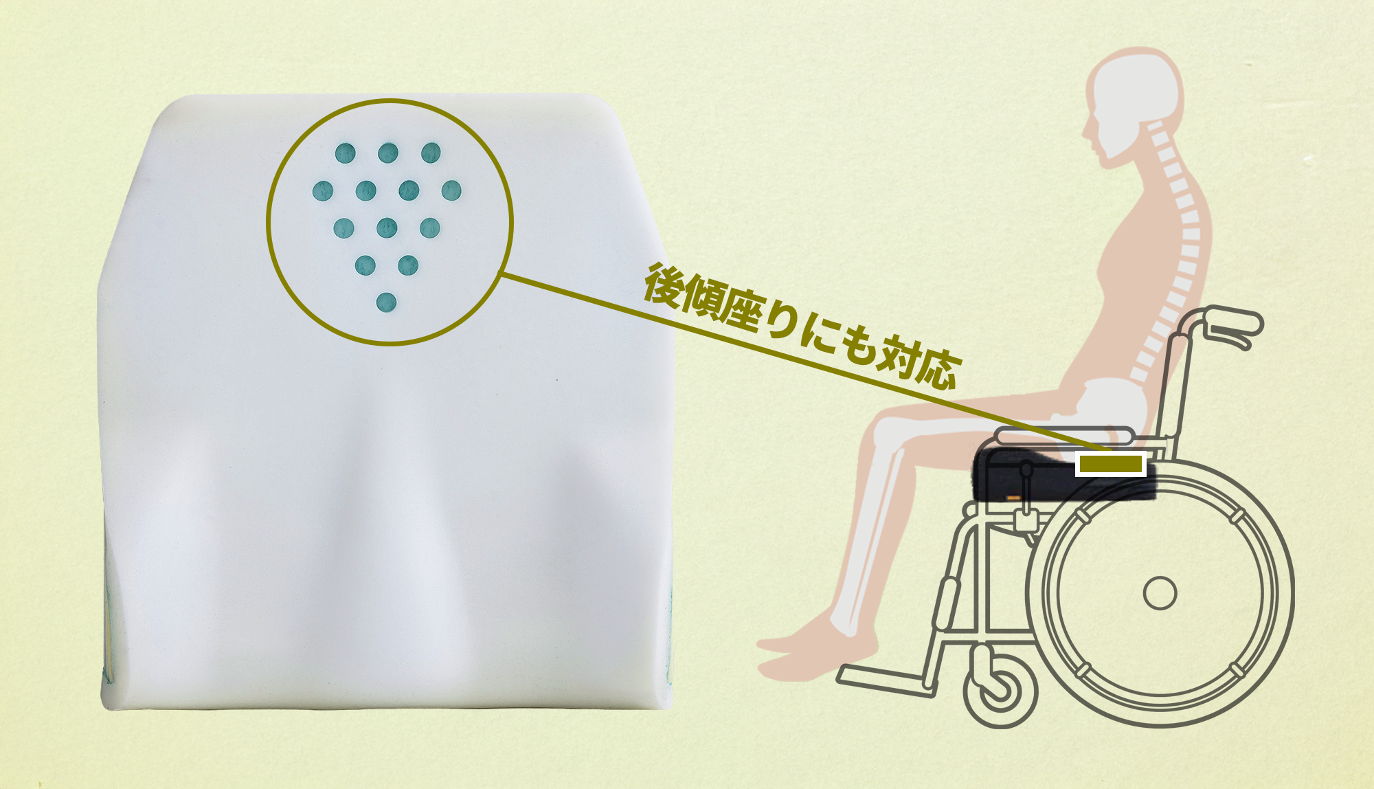 新たに加わった機能。13個のくぼみ形状により、尾骨・仙骨部の圧分散を効果的に行います。骨盤が後傾した座り姿勢に対応します。