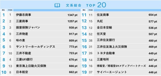 1. 文系総合:伊藤忠商事が5年連続の首位獲得。幅広い業界に支持が分散