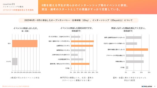 2025年9月、ワークス・ジャパンが行った27卒学生を対象とした調査では、夏休みの段階で8割を超える学生がインターンシップ等のイベントに参加していると回答しました。