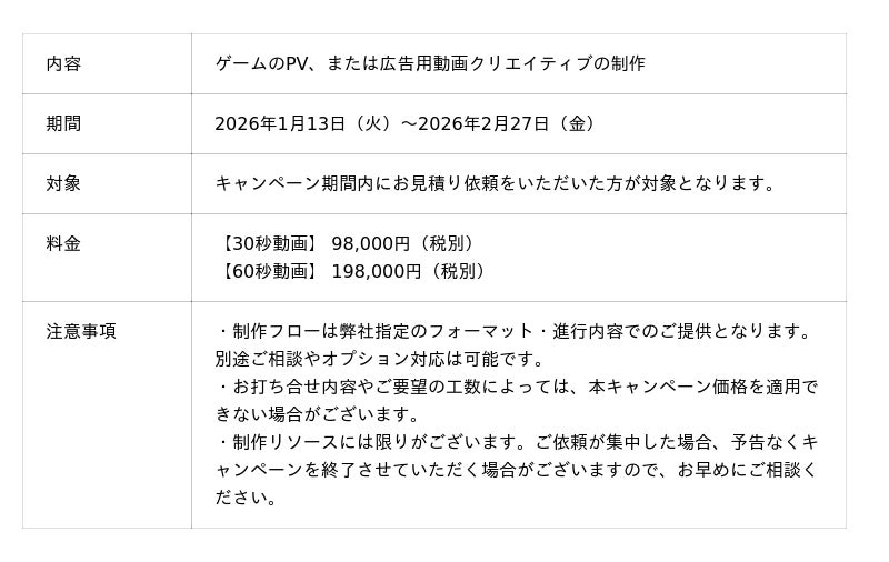 本キャンペーンでは、高品質を維持しながら、制作フローを最適化することで破格の料金設定を実現しております。【新春スタートダッシュ企画】ゲームPV1本98,000円~超激安制作祭り 概要