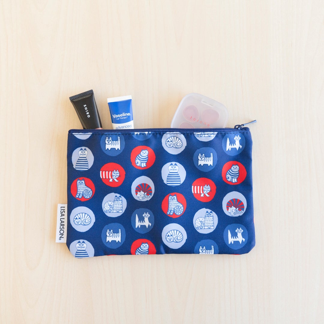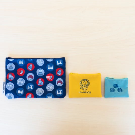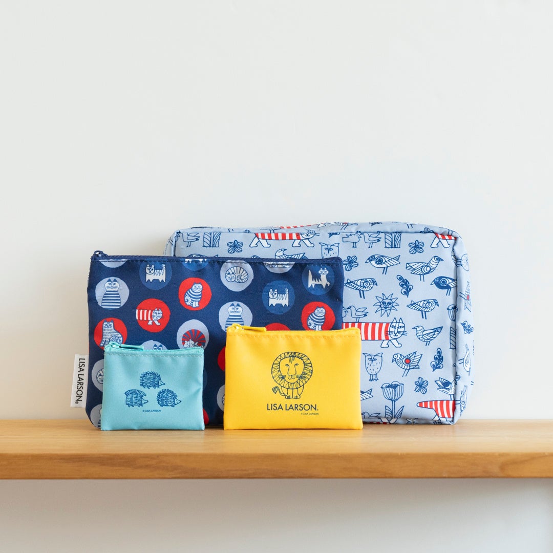 形やサイズの異なる4つのポーチは、日常使いから旅行まで幅広いシーンで活躍。マイキーをはじめ、ライオンやハリネズミなど、リサ・ラーソンの人気モチーフをあしらった、整理収納に便利で大人かわいいセットです。