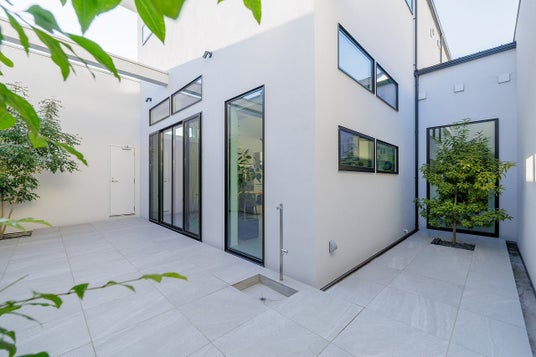 その特徴が特に表れているのは、一階のリビング・ダイニング。LDKと玄関ホールを囲むL字型の中庭をつくり、4メートルの高さのある壁でぐるりと囲みました。そうすることで、建蔽率に含まれない庭が、室内の延長のようなプライベートな空間になります。
